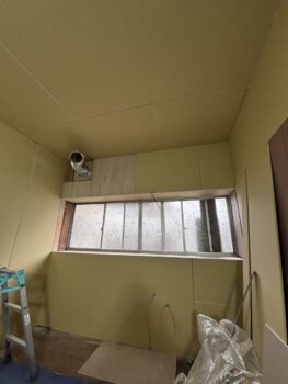 まずはキッチンの解体をしてからクロスを貼る為の石膏ボードの重ね貼りをします。