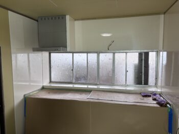 こそ後キッチンパネルを貼りキッチン下台の設置です。