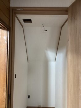 階段下なので勾配天井で、照明と換気扇を設置するために少し天井高を下げました☆彡あとはクロスを貼って便器を取り付けてトイレ室は完成です\(^o^)/